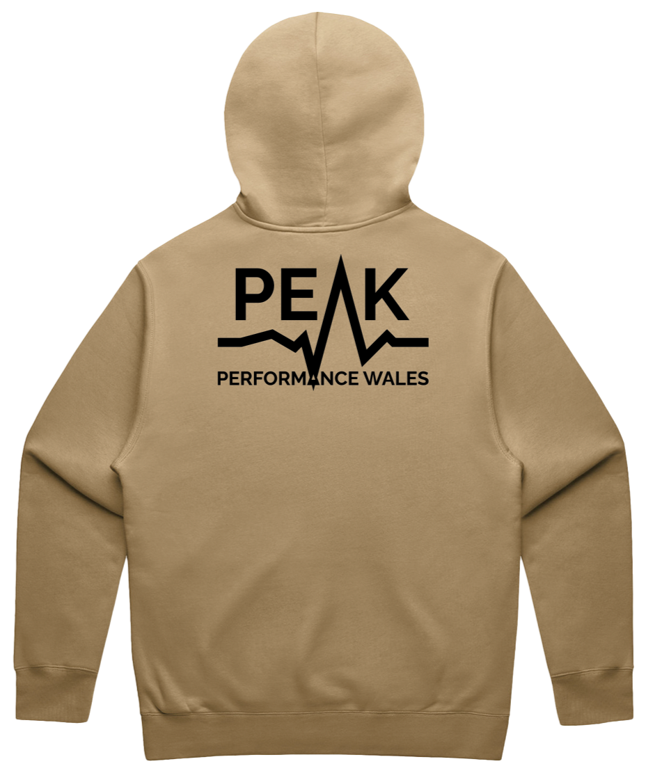 Made from 60% cotton and 40% recycled polyester fleece, featuring the Peak Performance Wales logo printed on both the back and front.